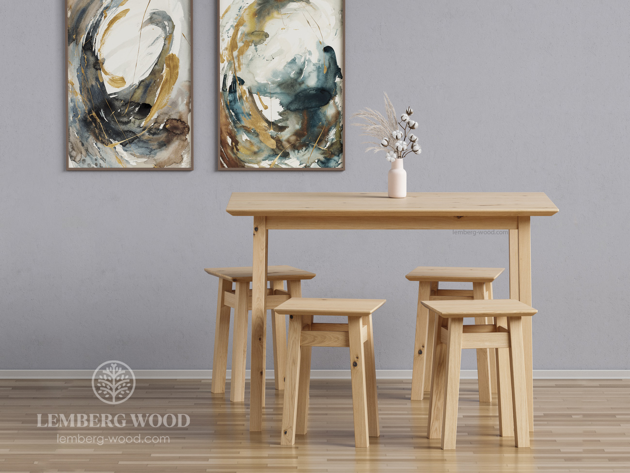 Prague table comes complete with 4 stools, but is also sold separately. Absolutely everything is made of ash. The natural material does not cause allergies, does not harm health and is safe for the environment. There are no harmful impurities in the composition.